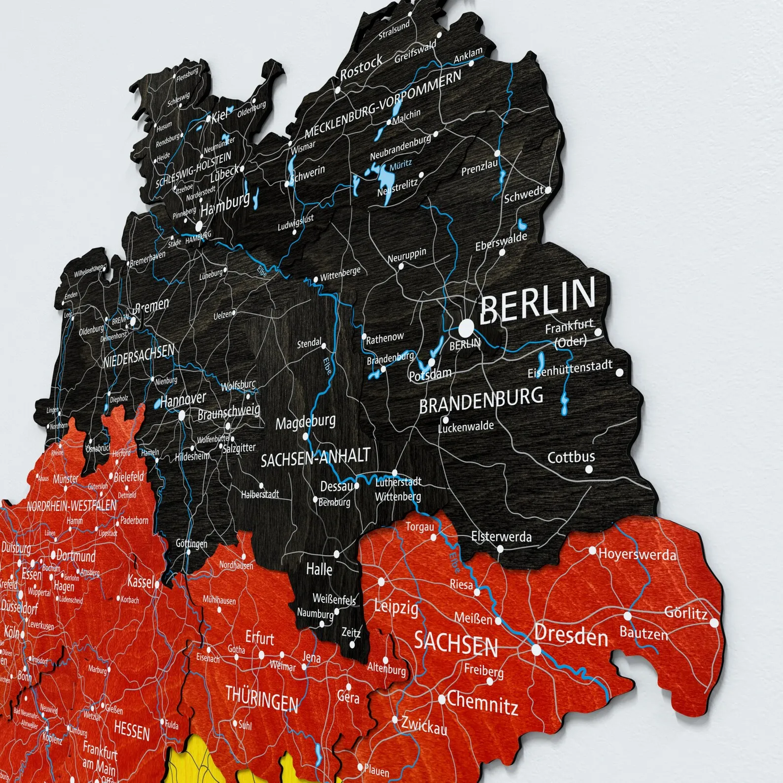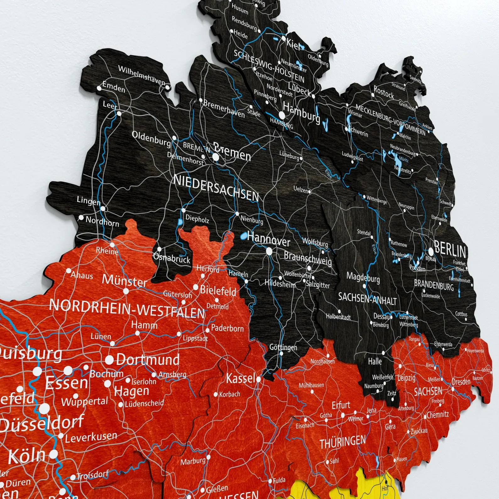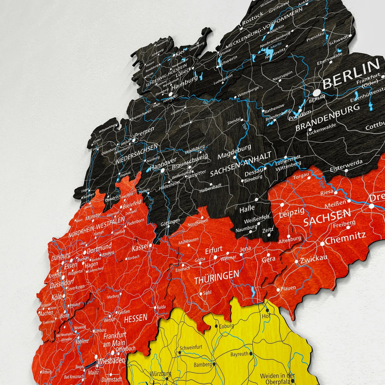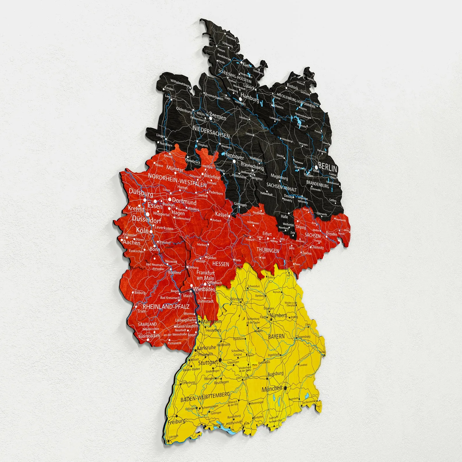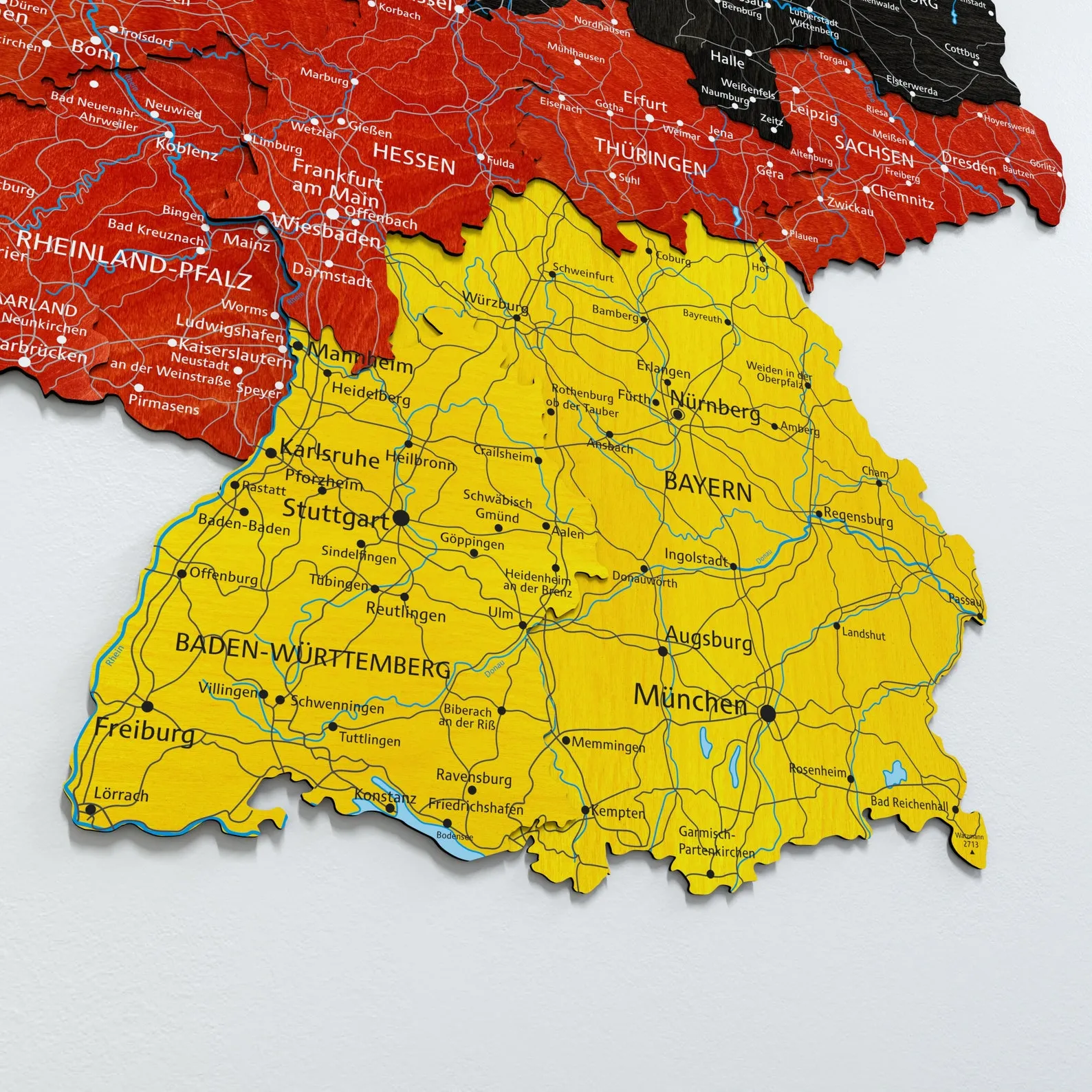 Germany Wooden Wall Map With Hidden Backing For Apartment Decor is a regional wall piece focused on the outline of Germany and its main internal borders. The map is cut from wood with multiple layers, giving depth to state divisions and surrounding areas. A discreet backing system allows the map to sit slightly away from the wall, producing a floating effect that matches contemporary interiors.