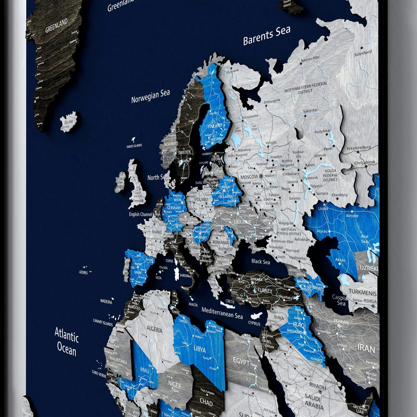 This map is designed for tracking journeys and planning future adventures. Small pins can be placed on major cities and regions, helping you mark family trips, business routes or dream destinations in a clear way. The surface is smooth, so pins can be added and moved carefully over time. When viewed from a distance, the panel reads as clean wall art with a subtle travel theme rather than a busy notice board.